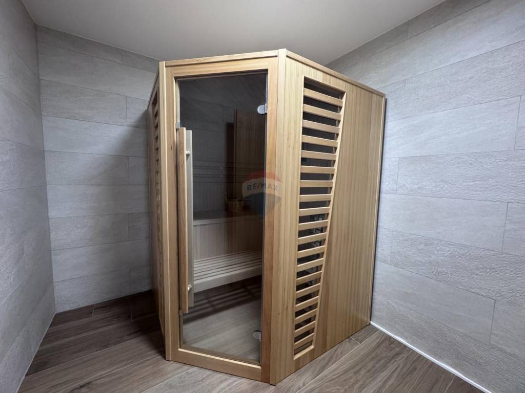 U suterenu vile nalazi se garaža za dva automobila, konoba, praonica rublja, strojarnica za bazen, spremište, hodnik i stubište za prvi kat, odnosno prizemlje. Prizemlje obuhvaća spavaću sobu s vlastitom kupaonicom, saunu, dodatnu kupaonicu, hodnik, kuhinju s blagovaonom, prostrani dnevni boravak te veliku terasu s izlazom na okućnicu na kojoj se nalazi bazen.
