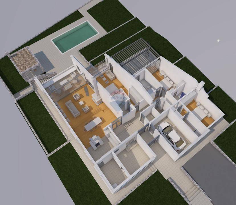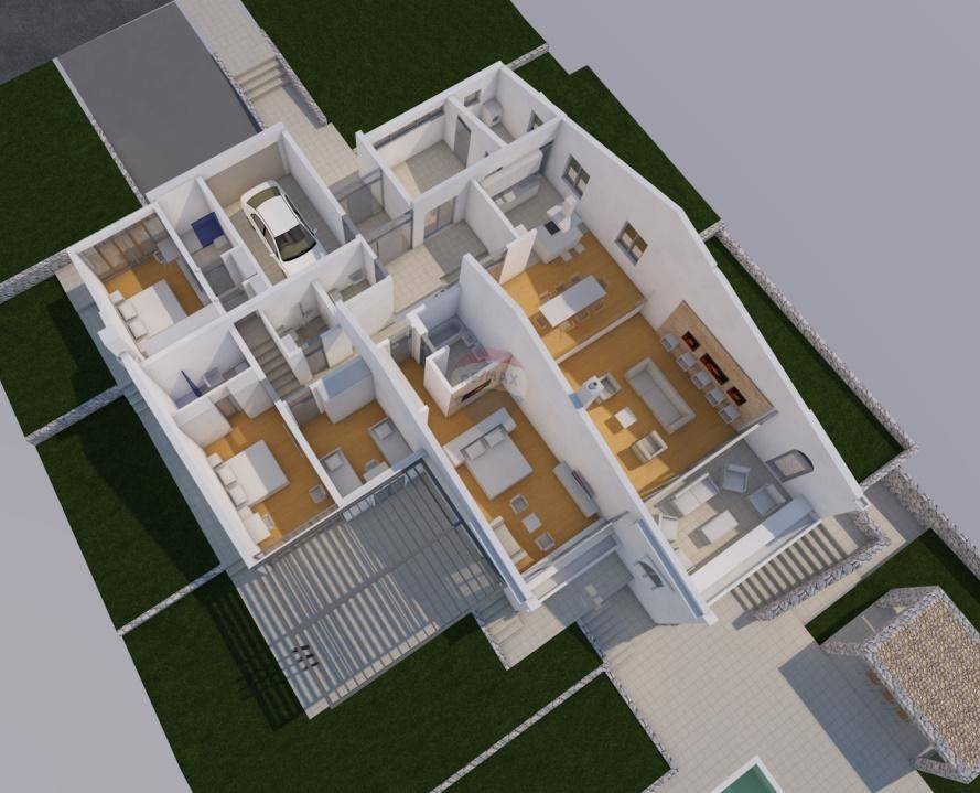 Unutrašnjost kuće osmišljena je funkcionalno i elegantno. Sastoji se od glavne spavaće sobe s vlastitom kupaonicom i izlazom na terasu, dvije dodatne spavaće sobe, još jedne kupaonice, zasebnog toaleta, vešeraja, kuhinje i dnevnog boravka koji vodi na terasu s pogledom na more. Tu su još i kotlovnica, spremište te garaža, što osigurava dodatni komfor i praktičnost.