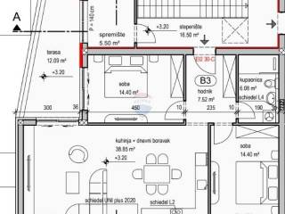 Stan se sastoji od dvije udobne spavaće sobe, prostranog dnevnog boravka povezanog s kuhinjom i blagovaonicom, moderno uređene kupaonice te natkrivene terase koja pruža dodatni prostor za opuštanje. Orijentacija stana je jugozapadna, što osigurava obilje prirodne svjetlosti tijekom cijelog dana.
