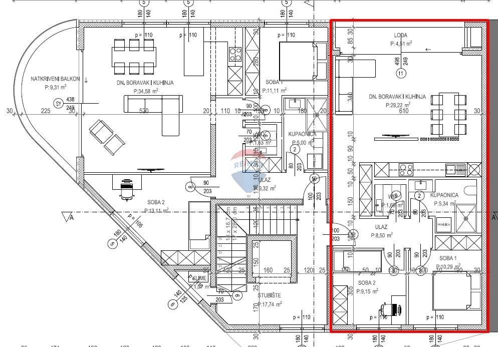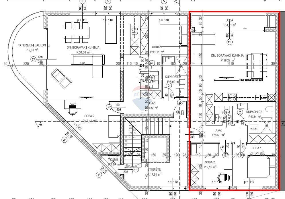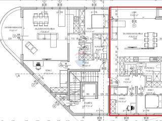 Stan se sastoji od hodnika, kupaonice, wc, dnevnog boravka, blagovaone i kuhinje otvorenog koncepta, dvije spavaće sobe te terase s koje se pruža vrhunski pogled na more,