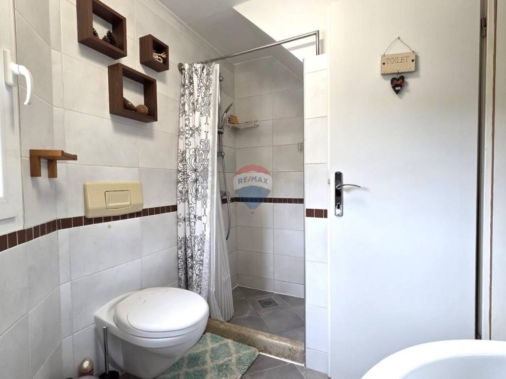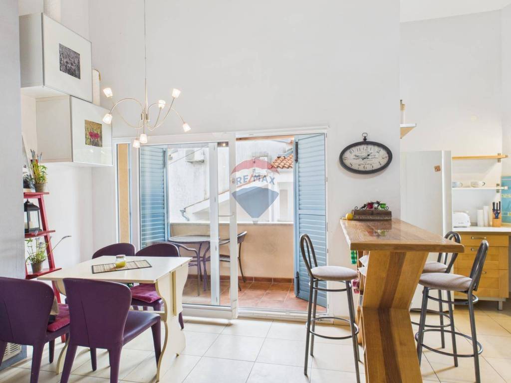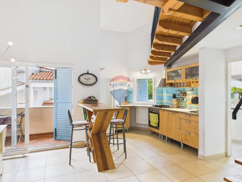 Na prodaju je dvoetažni stan smješten na oko 500 metara od plaže. Nalazi se na prvom katu i potkrovlju manje stambene zgrade. Na donjoj etaži nalaze se spavaća soba, kupaonica te kuhinja s blagovaonicom koja ima izlaz na natkrivenu terasu. Unutarnje stepenice vode na gornju etažu gdje su dnevni boravak, radna soba/igraonica i spavaći prostor s bračnim krevetom.