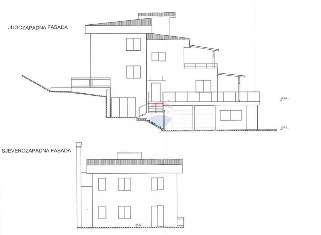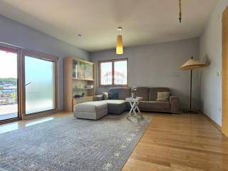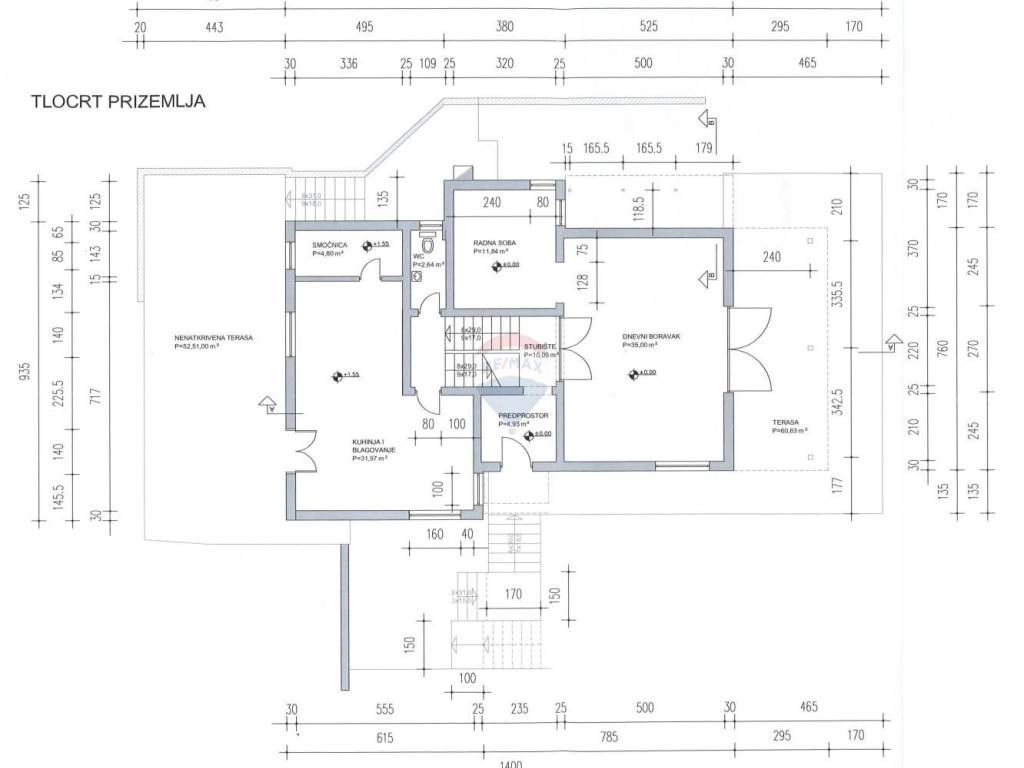 Prizemlje: Prostrana dnevna soba iz koje se ide u radnu sobu te na veliku terasu s pogledom na okolinu. Par stepenica vode u kuhinju koja ima izlaz na stražnju, sjevernu terasu koja je idealna