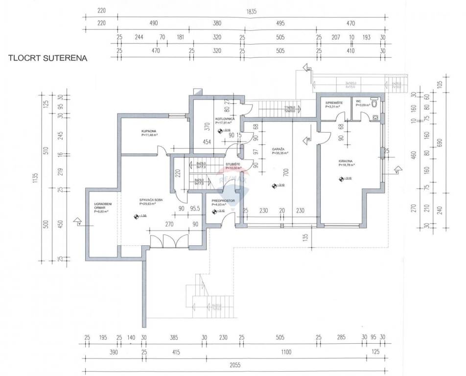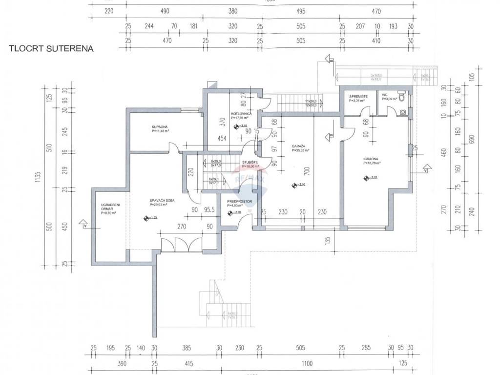 Suteren: dvostruka garaža, kotlovnica s praonicom, jedna prostorija koja može imati razne namjene kao npr. teretana, igraonica, spremište i sl. a uz koju se nalaze kupaonica i manje spremište.