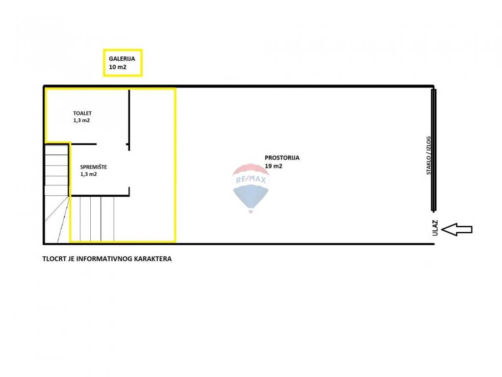 Sastoji se od jedne veće prostorije od cca 19 m2, ostave, sanitarnog čvora i galerije od cca 10 m2.