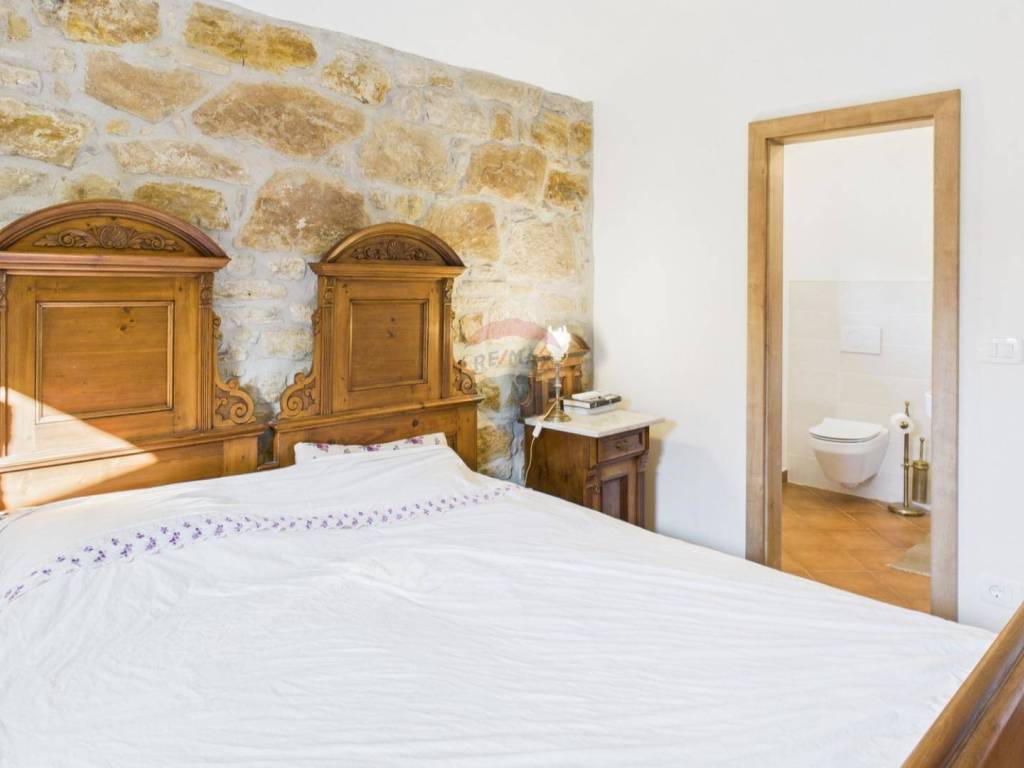 Interijer kuće pomno je uređen s pažljivo odabranim restauriranim antiknim namještajem te umjetninama koje prostoru daju dozu glamura i elegancije, stvarajući ugođaj sofisticiranog doma s dušom.