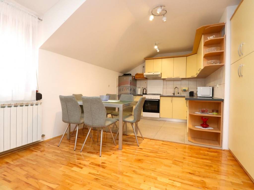 Prodaje se stan na prvom katu kuće s dva etažirana stana u Mrkšinoj ulici u Svetoj Klari. Sastoji se od dvije spavaće sobe, open space dnevnog boravka s kuhinjom i blagovaonicom, kupaonice i prostrane natkrivene terase. U dvorištu se nalazi zajednički uređeni vrt, prostor za parkiranje i pripadajuća ostava. Grijanje je etažno centralno na plin. Uredan i održavan stan bez potrebe za ulaganjem u renovaciju. Vanjska natkrivena terasa je vrlo prostrana i iskoristiva s površinom od 30m2. U dvorištu se nalazi zajednički uređeni vrt, prostor za parkiranje i pripadajuće spremište. Mirna lokacija i susjedstvo. Udaljenost od dvjesto metara do stanice javnog prijevoza i deset minuta šetnje do osnovne škole. Uredno vlasništvo i dokumentacija. Mogućnost kupnje stambenim kreditom. Mogućnost zamjene za manji stan uz nadoplatu.