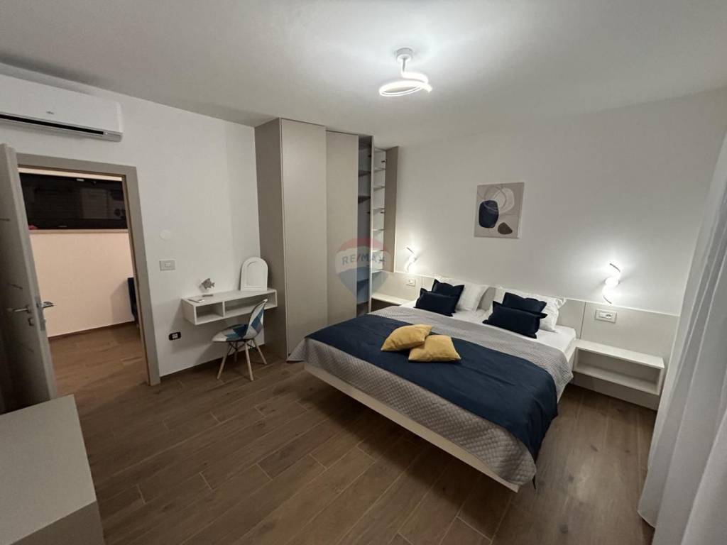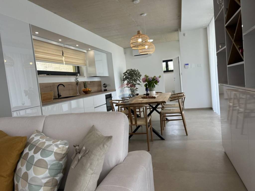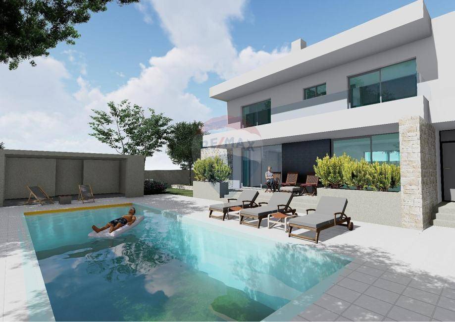 Na katu su tri spavaće sobe s kupaonicama i balkonom s pogledom na more. U kući ce biti izvedeno grijanje i hlađenje s 5 jedinica klima uređaja i prva faza podnog centralnog grijanja na dizalicu topline. U dvorištu bazen površine 40 m2, travnjak s automatskim navodnjavanjem, parkiralište za tri automobila.