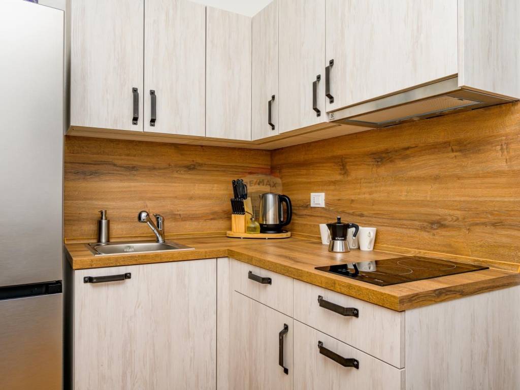 Studio apartman uključuje bračni krevet, čajnu kuhinju i moderno uređenu kupaonicu.