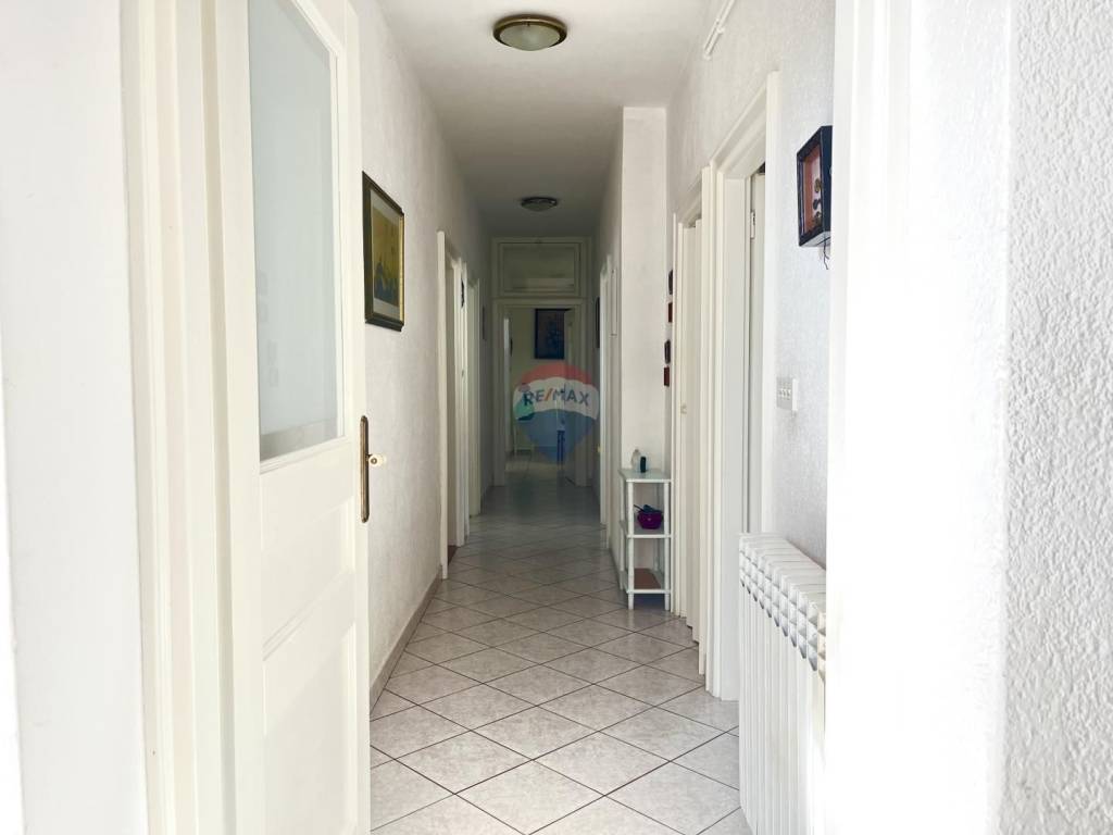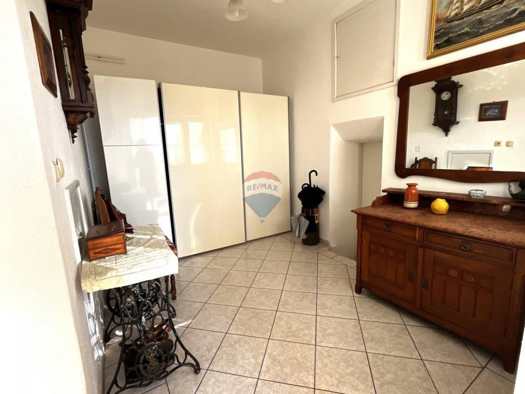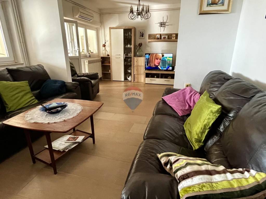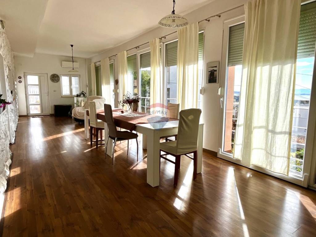 Veći stan od cca 100 m2, smješten na prvom katu, impresionira već na ulazu, gdje se nalazi predsoblje. Dug hodnik vodi do velike glavne spavaće sobe, te manje sobe s vlastitom kupaonicom. Tu su i zasebna kupaonica kao i povezani dnevni boravak s kuhinjom, stvarajući funkcionalan i ugodan prostor za svakodnevni život. Posebnost ovog stana zasigurno je velika, staklom zatvorena terasa pretvorena u predivan blagavaonski prostor s velikim stolom i nezaboravnim pogledom na more.