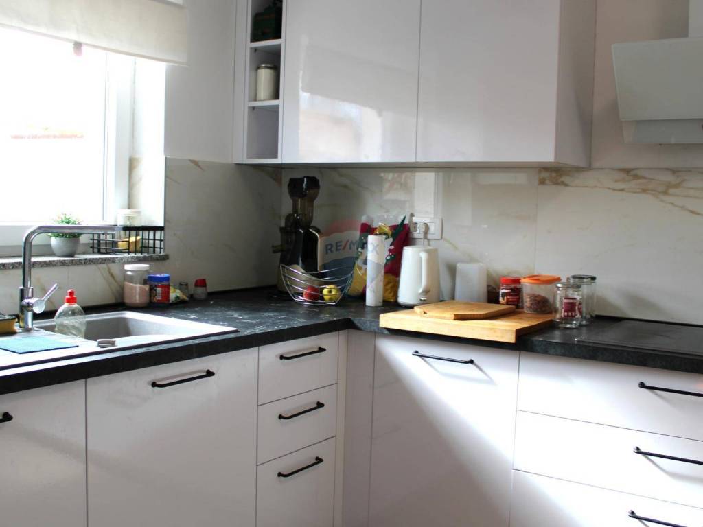 U prizemlju se nalazi kuhinja s blagovaonicom, te prostrani dnevni boravak koji pruža izlaz na vanjski prostor. Ova etaža također sadrži kupaonicu i spremište, čineći je funkcionalnom i ugodnom za svakodnevni život.
