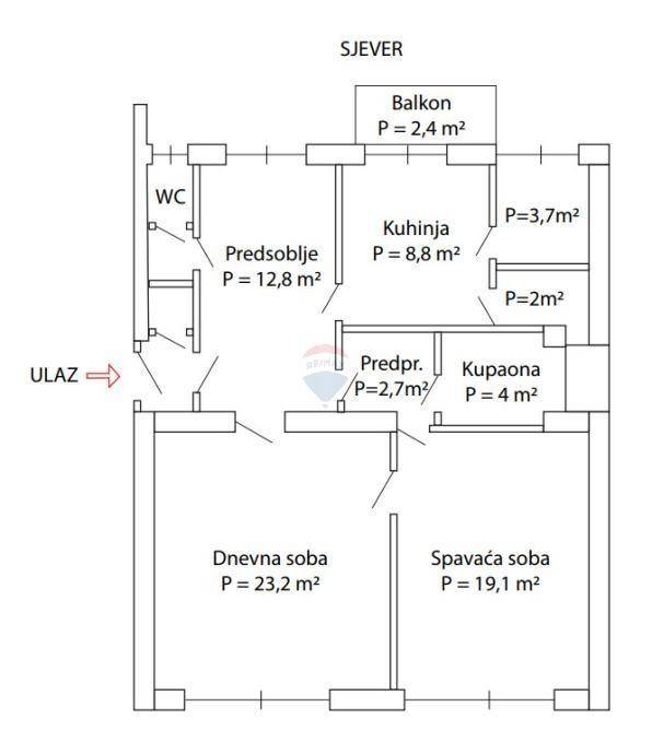 Sastoji se od ulaznog hodnika, predsoblja, spavaće sobe, dnevnog boravka, kuhinje sa blagovaonom, kupaonice, WC-a, te balkona.