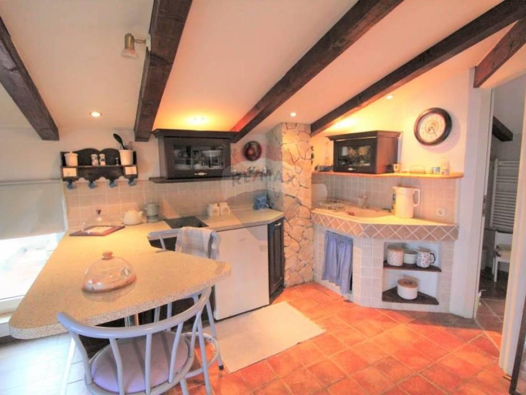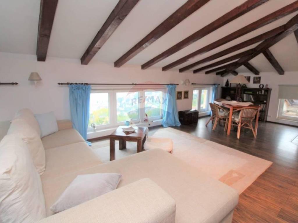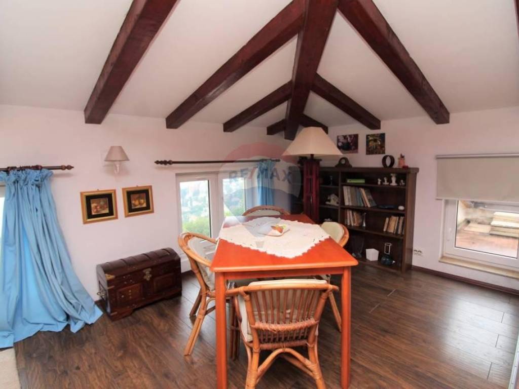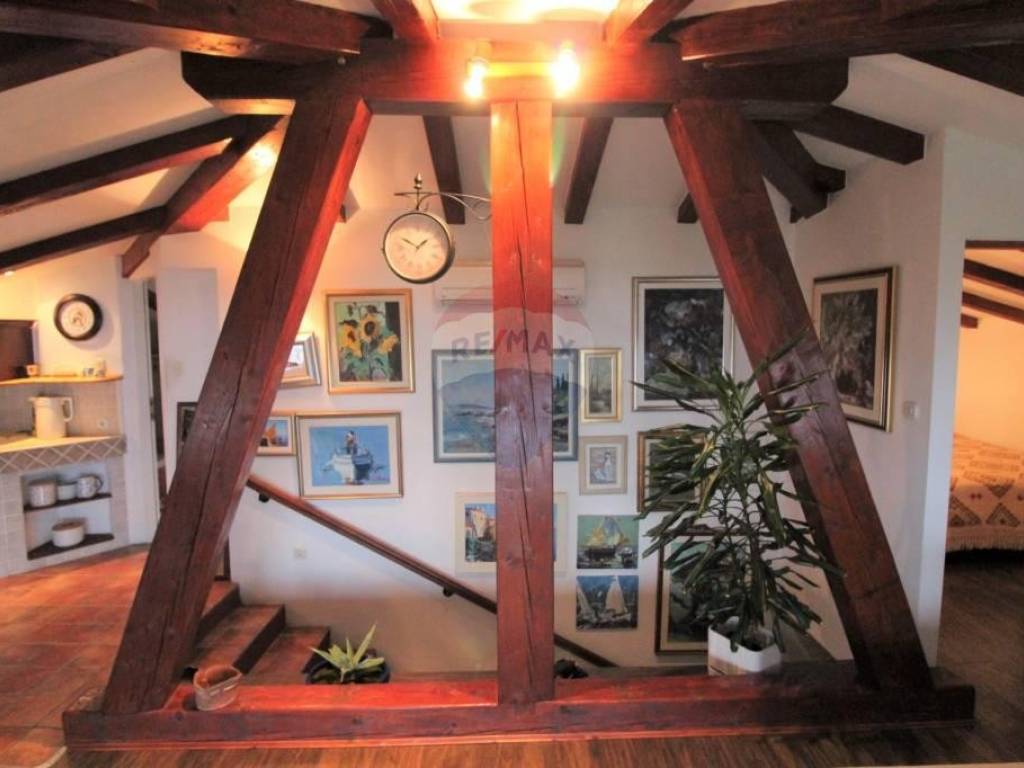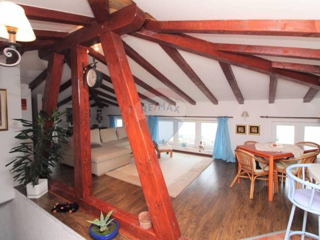 OPATIJA - ovaj rustikalno uređeni stan u potkrovlju, od ukupno 78m2, nalazi se iznad Slatine. Sastoji se spavaće sobe, kupaonice, kuhinje,blagavaonice,dnevnog boravka, ostave i stepeništa. Na prvom katu nalazi se još 1 soba sa kupaonicom koja je za sada odvojena od ostalog dijela.Na istočnom i zapadnom dijelu stana dozvoljena je izgradnja 2 terase. Stanu pripadaju 3 parkirna mjesta ispred zgrade( mogu poslužiti i kao terasa!) Stan se nalazi na povišenom dijelu tako da ima predivan pogled na more.