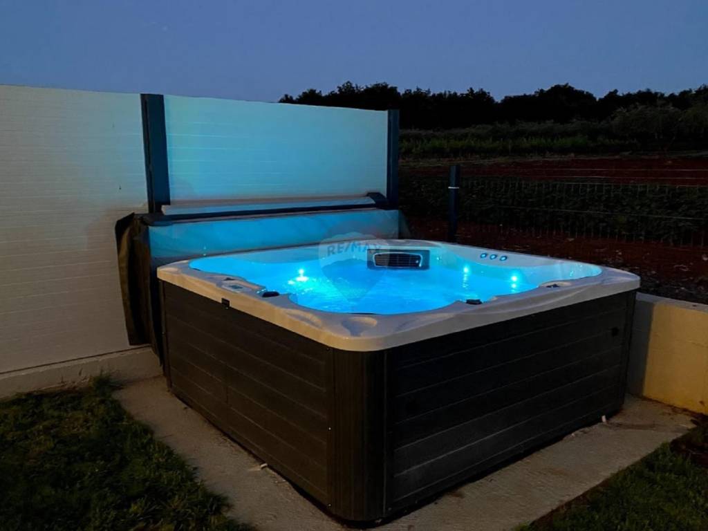 U okućnici se nalazi grijani bazen od 26,5 m2 s vodopadom i masažnim pumpama, sunčalište, jacuzzi, sauna, roštilj, dječje igralište i trampolin te parking.