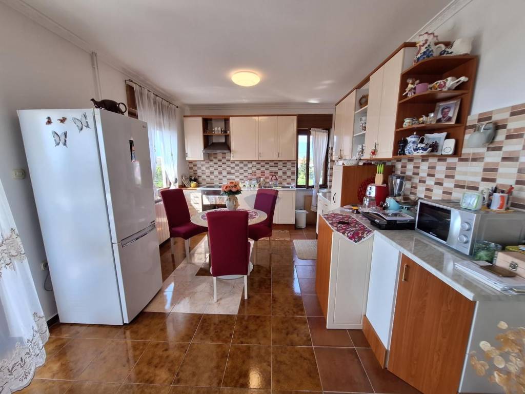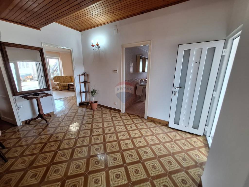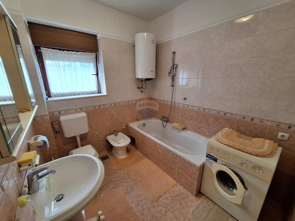 Sastoji se od 3 stana (suteren, prizemlje i kat), garaže, konobe te velike okućnice s koje se pruža lpogled na more.