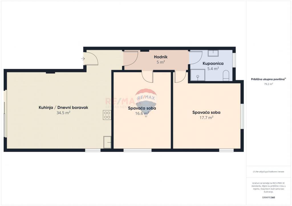 Stan se sastoji od prostranog dnevnog boravka i kuhinje s izlazom na veliku terasu, dvije spavaće sobe i kupatila, te jednog parking mjesta.