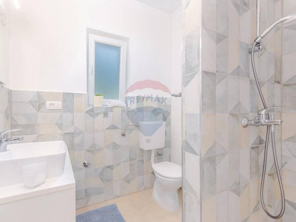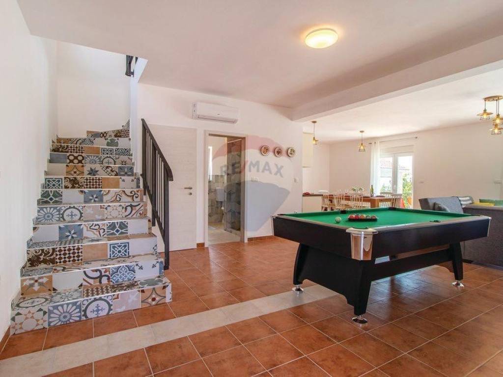 U prizemlju se nalazi dnevni boravak sa kuhinjom i blagovaonom, kupaona, ostava/vešeraj i terasa sa izlazom na bazen sa prekrasnim panoramskim pogledom na more i otoke.