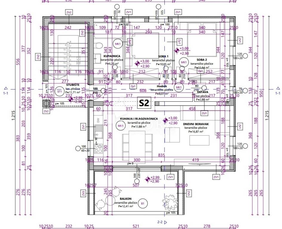 U Vodicama, u mirnom okruženju i manjoj stambenoj zgradi s ukupno tri apartmana, smješten je dvosobni apartman ukupne korisne površine 78,30m². Apartman S2 nalazi se na 1. katu te ima stambenu površinu od 69,59 m². Sastoji se od hodnika, ostave, kupaonice, dvije spavaće sobe te dnevnog boravka s kuhinjom i blagovaonicom, iz kojih se izlazi na terasu površine 12,41m2 m². Apartman će biti opremljen podnim grijanjem u kuhinji s blagovaonicom, dnevnom boravku i kupaonici, klima-uređajima u spavaćim sobama i dnevnom boravku, PVC stolarijom s roletama i komarnicima te električnim podizačima roleta, kao i vrhunskom keramikom i sanitarnom opremom. Apartmanu pripadaju i dva parkirna mjesta. Objekt je udaljen 1.100 m od plaže i 900 m od centra mjesta. Planirani rok useljenja je kraj 2027. godine.