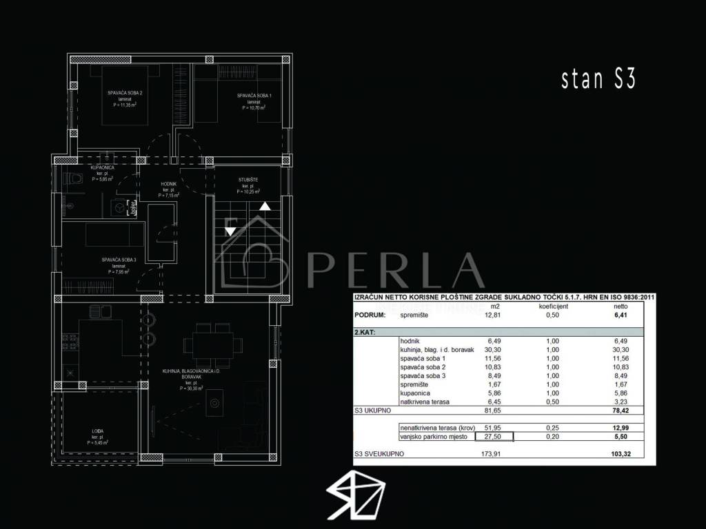 S3 - trosoban stan S3 (103,32 m2) na 2. katu s pripadajućom krovnom terasom - 502.377,00 €