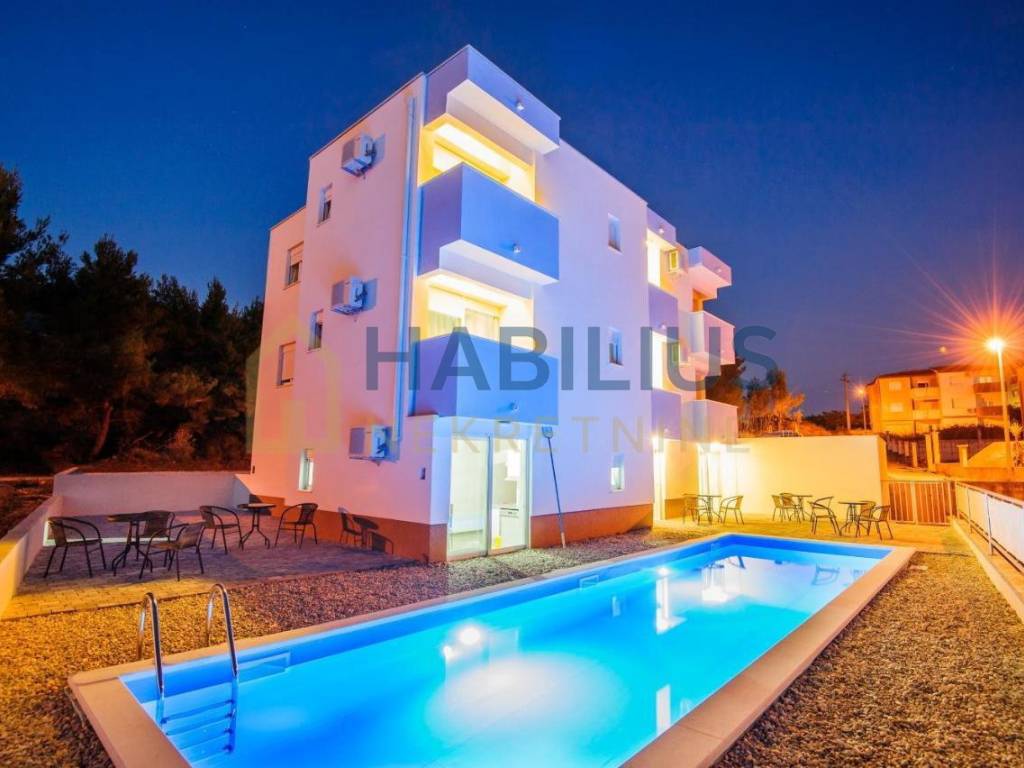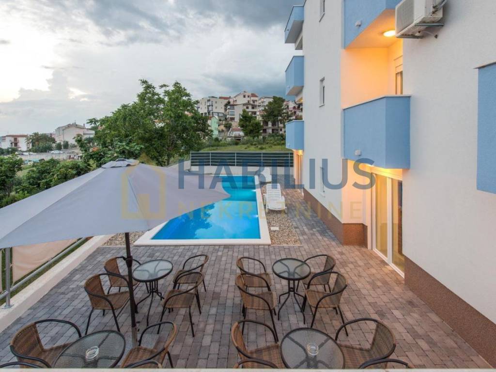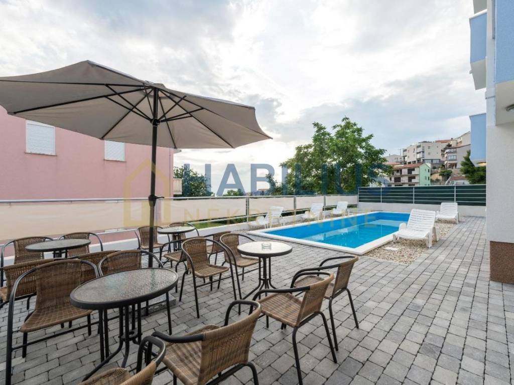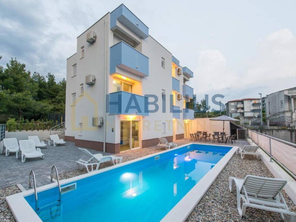 Prodaje se urbana villa sa bazenom u Podstrani s pogledom na more. Ima četri etaže i sveukupno 8 apartmana, te zasebne dvije sobe s kupatilom. Villa može primiti do 20 gostiju. Svaki apartman ima zasebnu kuhinju. Svi apartmani su klimatizirani, wifi. Vanjski bazen je veličine 33 m2, a dvorište pruža sve što treba za vrhunski odmor (ležaljke, suncobrani, roštilj). Postoji parking za 8 auta, te veliki podrum od 80 m2. Udaljenost od plaže je 400 m, otvoren pogled, u blizini svih sadržaja. Vlasništvo je uredno, a cijena je 1.100.000 €