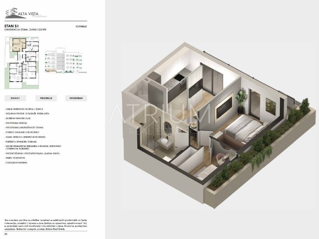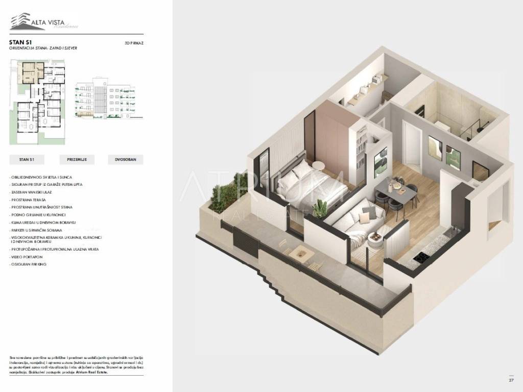 Orijentacija prema zapadu i sjeveru omogućuje ugodnu temperaturu tijekom ljetnih mjeseci te opuštajuće večernje trenutke u privatnom vanjskom dijelu stana.