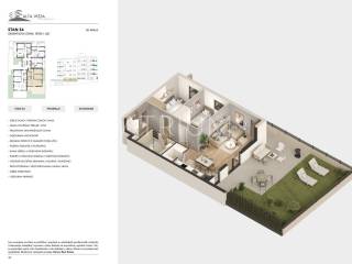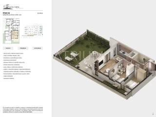 Stan je orijentiran prema jugoistoku i ima ukupnu površinu od 153,95 m². Raspored prostorija je sljedeći: ulazni prostor 4,16 m², kupaonica 5,38 m², izba 2,46 m², kuhinja s blagovaonicom i dnevnim boravkom 27,36 m², dvije spavaće sobe 11,84 m² i 11,62 m², hodnik 4,47 m², nenatkrivena terasa 2,75 m², natkrivena terasa 17,94 m² te privatni vrt 65,96 m².