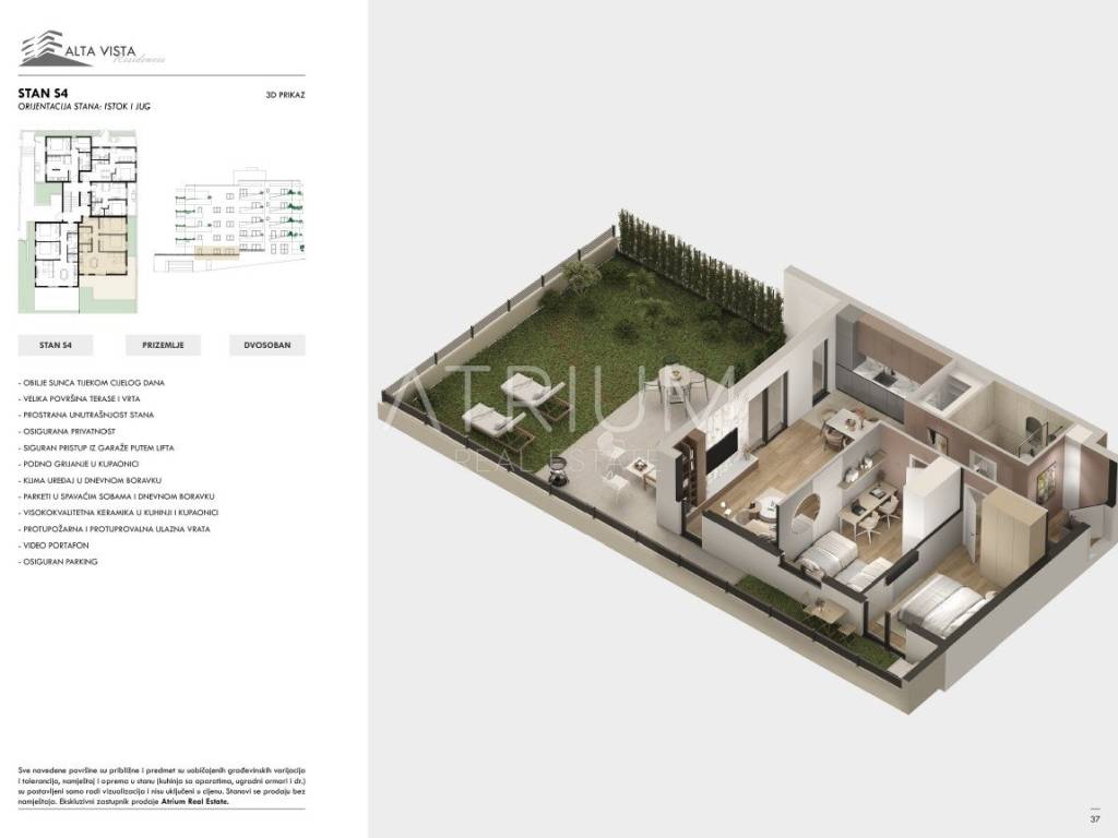Prodaje se prostrani dvosoban stan S4 s privatnim vrtom u prizemlju novogradnje u okviru projekta Alta Vista, smješten u Segetu Donjem kod Trogira, samo 400 m od plaže i šetnice uz more. Zgrada ima lift, garažu, terase s pogledom, a nalazi se na mirnoj lokaciji s odličnom prometnom povezanošću. Stan je idealan za turistički najam, investiciju ili cjelogodišnji život.
