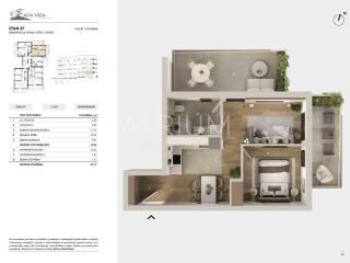 Stan se nalazi na prvom katu i orijentiran je prema istoku i sjeveru, što omogućava obilje jutarnjeg i dnevnog svjetla. Ukupna površina stana iznosi 62,19 m², a prostorije su funkcionalno raspoređene: ulazni prostor 2,96 m², kupaonica 5,09 m², kuhinja s blagovaonicom 11,75 m², dnevni boravak 9,97 m², spavaća soba 10,32 m², natkriveni balkoni 13,65 m² i 7,32 m² te privatna zelena površina 1,14 m².