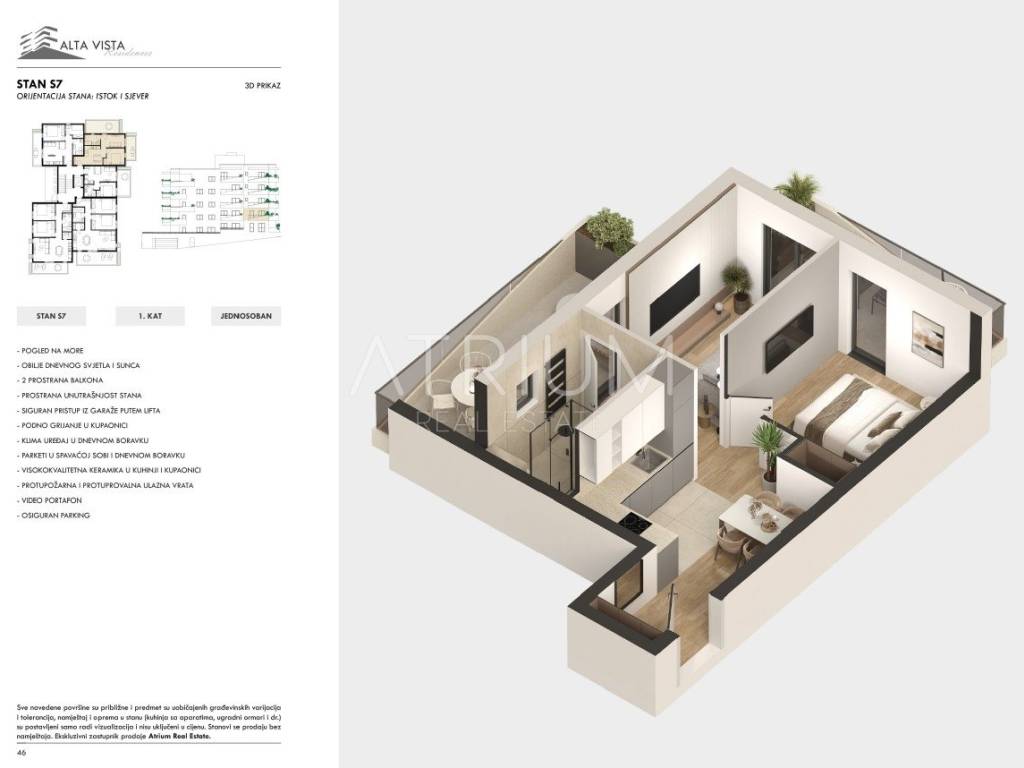 Prodaje se moderan jednosoban stan S7 u novogradnji projekta Alta Vista, smještenoj samo 400 m od plaže i šetnice uz more. Idealno za turistički najam, investiciju ili cjelogodišnji život.