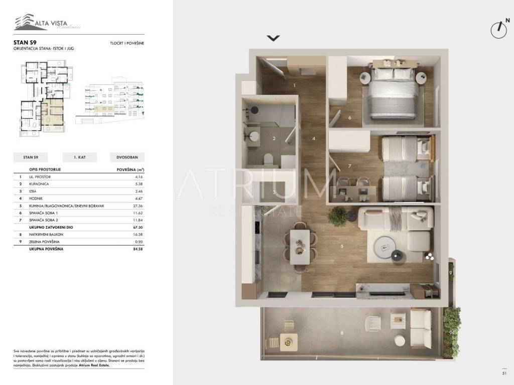 Stan se nalazi na prvom katu i orijentiran je prema jugo-istoku, što osigurava obilje jutarnjeg i dnevnog svjetla. Ukupna površina stana iznosi 84,58 m², a prostorije su funkcionalno i komforno raspoređene: ulazni prostor 4,16 m², kupaonica 5,38 m², izba 2,46 m², kuhinja s blagovaonicom i dnevnim boravkom 27,36 m², spavaće sobe 11,84 m² i 11,62 m², hodnik 4,47 m². Natkriveni balkon od 16,38 m² i privatna zelena površina od 0,90 m² pružaju idealan prostor za uživanje na otvorenom.