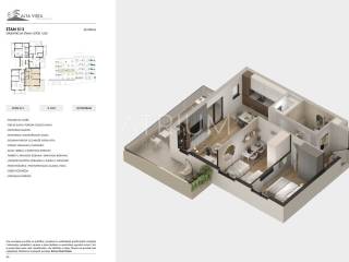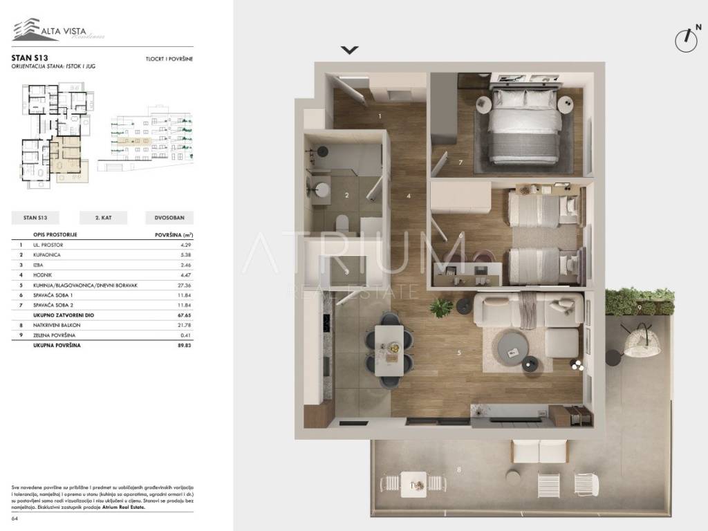 Na prodaju je moderan dvosoban stan S13, smješten na drugom katu zgrade, s očaravajućim pogledom na Jadransko more i okolne dalmatinske otoke. Stan je orijentiran prema jugo-istoku, što osigurava obilje jutarnjeg i dnevnog svjetla. Ukupna površina stana iznosi 89,83 m², a prostorije su funkcionalno i komforno raspoređene: ulazni prostor 4,29 m², kupaonica 5,38 m², izba 2,46 m², kuhinja s blagovaonicom i dnevnim boravkom 27,36 m², dvije spavaće sobe po 11,84 m² i hodnik 4,47 m². Natkriveni balkon od 21,78 m² i privatna zelena površina od 0,41 m² pružaju idealan prostor za uživanje na otvorenom.