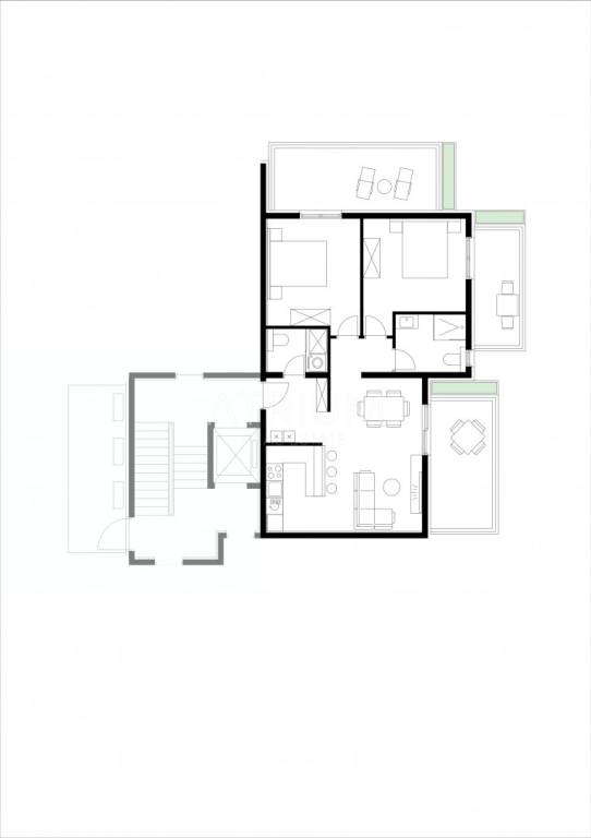Posebnost stana su tri natkrivena balkona: svaka spavaća soba ima svoj privatni balkon, dok treći balkon izlazi iz dnevnog boravka, ukupne površine 31,88 m², uz privatnu zelenu površinu od 1,80 m² – idealno za uživanje na otvorenom.