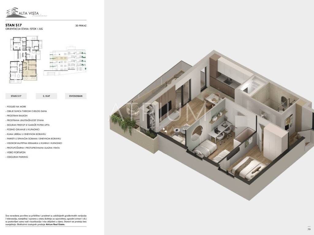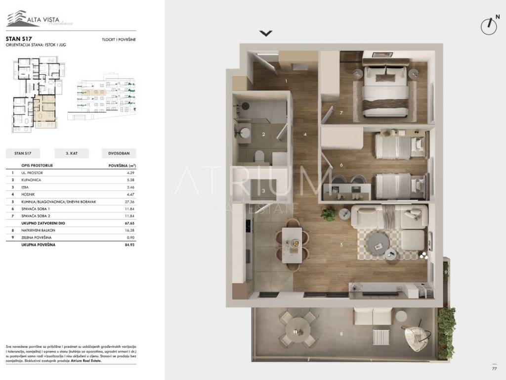 Na prodaju je moderan dvosoban stan S17, smješten na trećem katu zgrade, s prekrasnim panoramskim pogledom na Jadransko more i okolne dalmatinske otoke. Stan je orijentiran prema jugu i istoku, što omogućava obilje jutarnjeg i dnevnog svjetla. Ukupna površina iznosi 84,93 m², a prostorije su raspoređene tako da pružaju maksimalnu udobnost i funkcionalnost: ulazni prostor od 4,29 m², kupaonica 5,38 m², izba 2,46 m², kuhinja s blagovaonicom i dnevnim boravkom 27,36 m², dvije spavaće sobe veličine 11,84 m² i hodnik 4,47 m². Natkriveni balkon ima 16,38 m², a privatna zelena površina 0,90 m², idealna za uživanje na otvorenom.