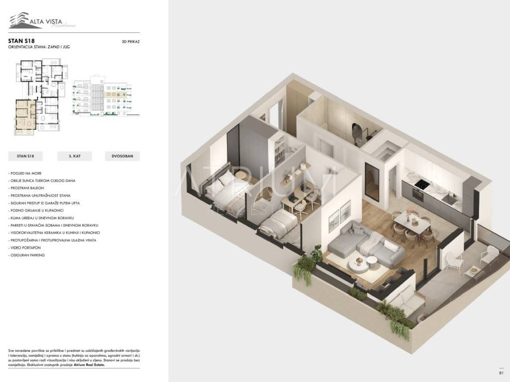 Na prodaju je elegantan dvosoban stan S18, smješten na trećem katu, s prekrasnim panoramskim pogledom na Jadransko more i dalmatinske otoke. Stan je orijentiran prema jugu i zapadu, što osigurava obilje prirodnog svjetla i predivne zalaske sunca. Ukupna površina stana iznosi 81,35 m², a prostorije su raspoređene tako da pružaju maksimalnu udobnost i funkcionalnost: ulazni prostor od 4,56 m², prostrana kupaonica od 5,26 m², izba od 2,01 m², kuhinja s blagovaonicom i dnevnim boravkom od 28,50 m², dvije spavaće sobe veličine 11,70 m² i 11,31 m², te hodnik od 4,95 m². Natkriveni balkon ima 12,01 m², a privatna zelena površina 1,05 m², što čini savršeno mjesto za uživanje na otvorenom.