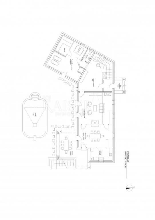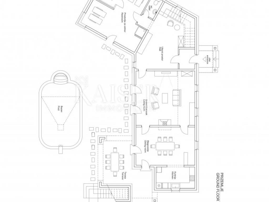 Prostrana okućnica lijepo je uređena i održavana. U centru okućnice smješten je lijepi bazen veličine 40 m2 sa uređenim sunčalištem.