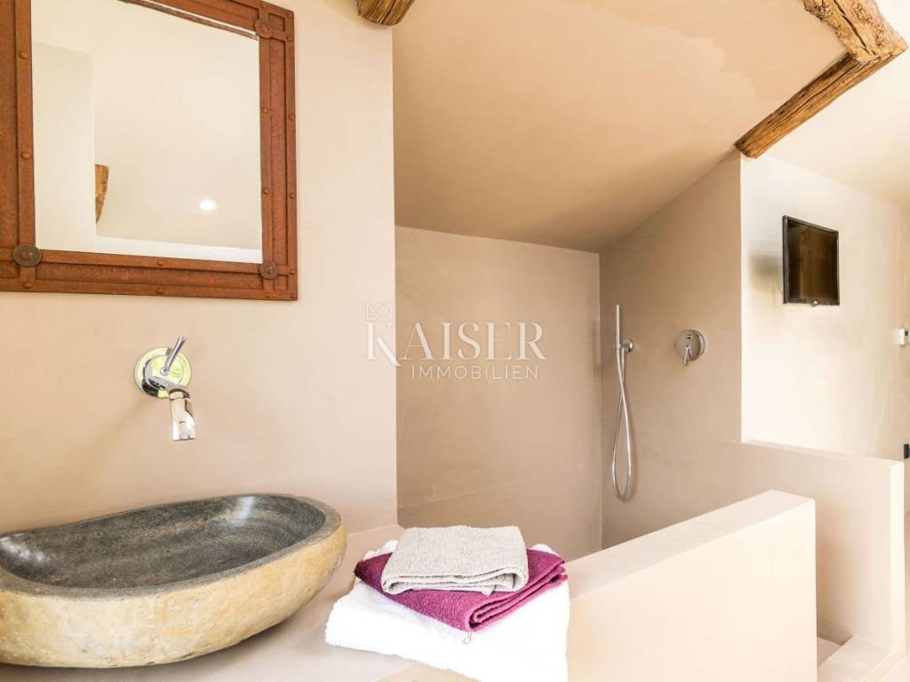 Kaiser Immobilien predstavlja kuću na prodaju u mirnom mjestu sa svega nekoliko kuća, a bajkoviti pogled na okolne brežuljke pruža se sa svakog kutka nekretnine. Osnovne karakteristike su maksimalna iskoristivost prostora, prirodni i autentični materijali. Poštivajući tradicijske autohtone vrijednosti i arhitekturu istarske baštine od stare kamene istarske kuće stvoren je pravi mali raj, dizajnerski elegantno i funkcionalno uređenim interijerom i eksterijerom. Pri rekonstrukciji je korišten istarski kamen i nove tehnologije. Sve površine u kući i bazenu izrađeni su s betonskom tehnikom. Ugrađeni elementi i ormari od hrastovog drva rađeni su po mjeri. Ugrađeno je podno grijanje, klimatizacija i kamin. Kuća se sastoji od prizemlja i kata. U prizemlju se u otvorenom konceptu prostora nalaze kuhinja, blagovaonica i dnevni boravak. U prizemlju se još nalazi sauna sa predivnim pogledom na prirodu i okolne brežuljke. Na katu se nalaze dvije spavaće sobe i dvije kupaonice. Na ograđenoj okućnici sa pogledom nalazi se grijani bazen površine 24 m²i sunčalište.