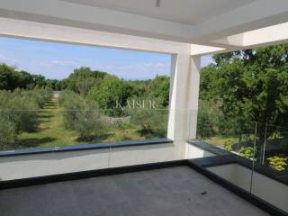Ovaj lijepi dvetažni stan prostire se kroz prizemlje i I kat ,a u suterenu nalaze se vešeraj i spremište. Ulaskom u predprostor prizemlja stana otvara se prostor dnevnog boravka, koji zajedno s blagovaonicom i kuhinjom zauzima površinu od 33 m2.Opisani dio stana povezan je velikom staklenom stijenom s bazenom i vrtom s jugozapadne strane novogradnje. Tu su još i jedna spavaća soba i kupaona s toaletom. Unutarnjim stubištem dolazimo na I kat gdje se nalaze još dvije spavaće sobe s terasom i dvije kupaone. Na podu soba predviđen je parket, a blagovaona ,kuhinja i dnevni kvalitetna keramika. Prostor koji odiše jednostavnošću elegancije. Vrt i bazen orijentirani su prema obližnjoj livadi i zelenilu okoliša koji pogled odmara i umiruje. Do mora i prvih plaža potrebno je 10 tak minuta autom, nešto manje do prvog večeg prodajnog lanca Plodine.