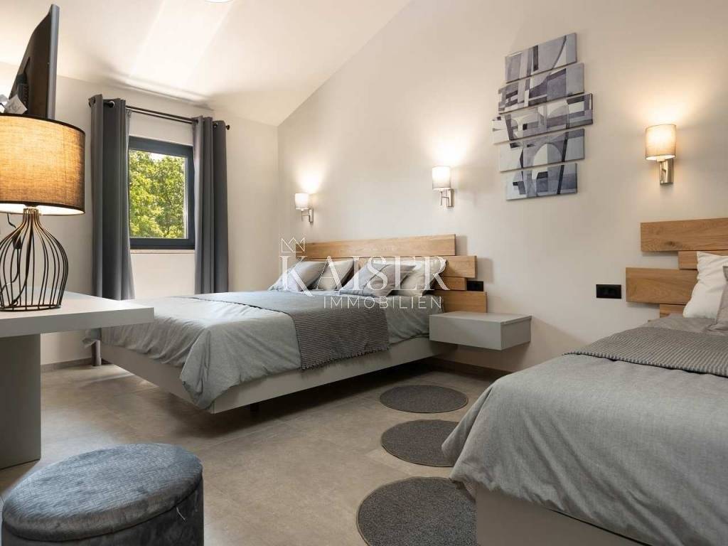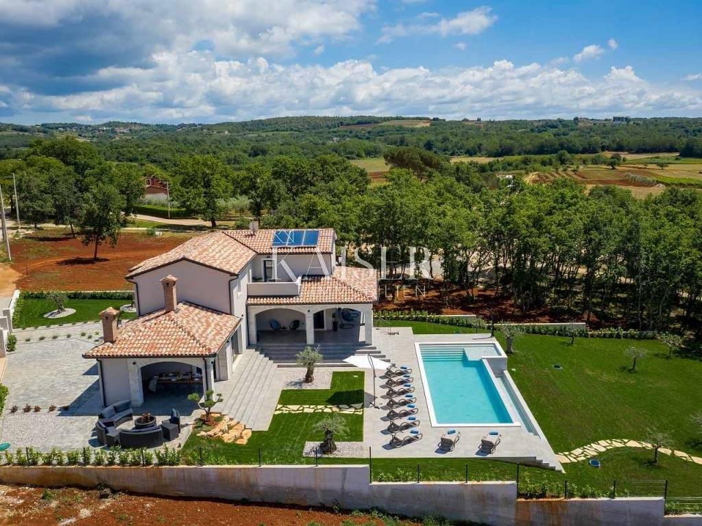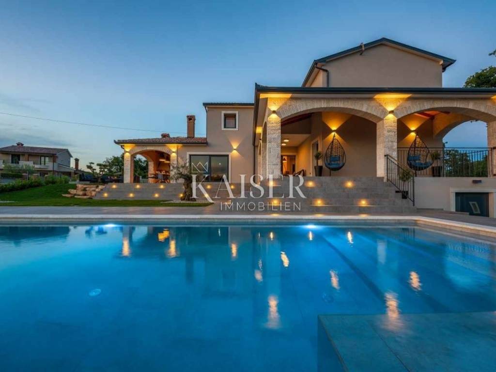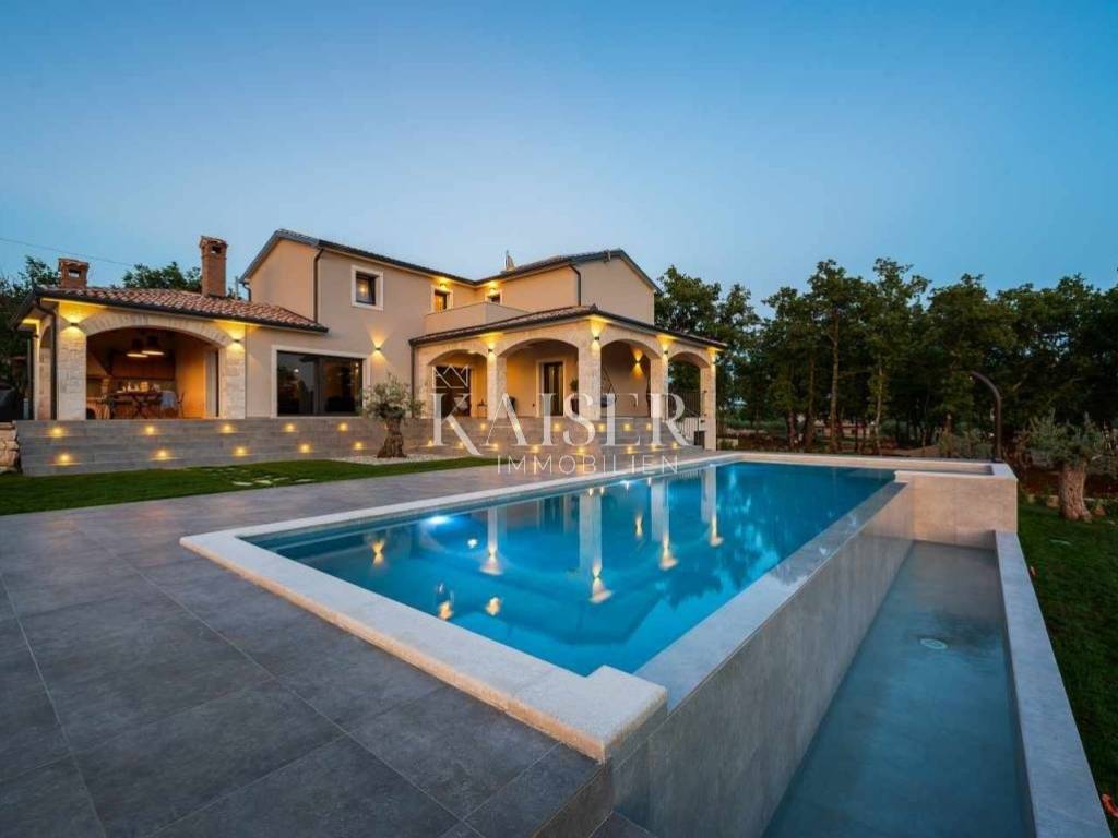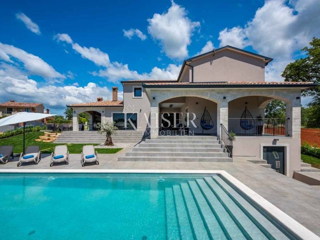 Kaiser Immobilien stavlja na prodaju kuću blizu mjesta Vižinada.U malom selu sa predivnim pogledom na more i prirodu nalazi se ova luksuzna, moderna i rustikalna vila koja je izgrađena 2020. godine i smještena je na privatnoj parceli od 1630 m2 . Sastoji se od prizemlja i prvoga kata. U prizemlju se nalazi potpuno opremljena kuhinja, blagovaonica i dnevni boravak, gostinjski toalet i spavaća soba sa vlastitom kupaonicom. Na prvom katu nalaze se još 3 spavaće sobe sa vlastitim kupaonama. Svaka soba posjeduje vlastiti TV te je klimatizirana. Uz 280m2 stambenog prostora vila također posjeduje i podrum od 90m2 koji je moguće opremiti po svom ukusu.