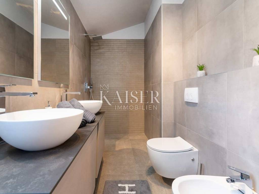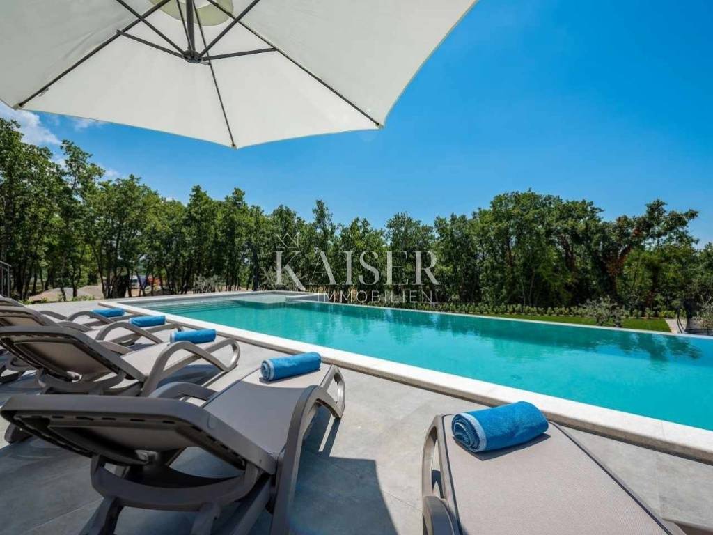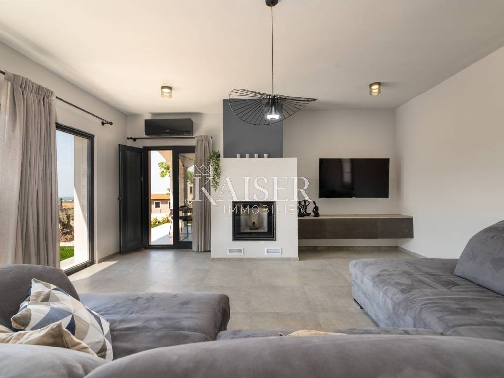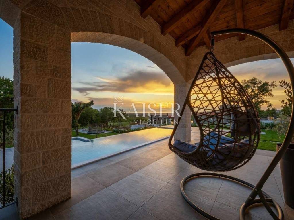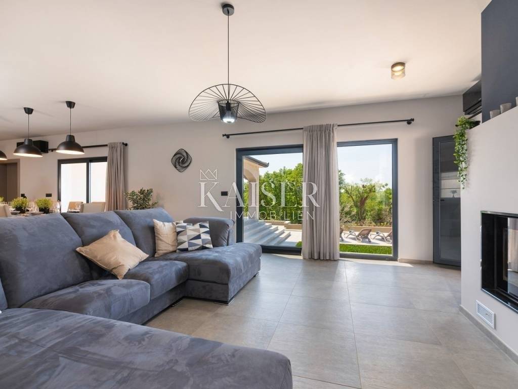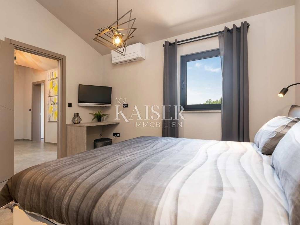 Kaiser Immobilien stavlja na prodaju kuću blizu mjesta Vižinada.U malom selu sa predivnim pogledom na more i prirodu nalazi se ova luksuzna, moderna i rustikalna vila koja je izgrađena 2020. godine i smještena je na privatnoj parceli od 1630 m2 . Sastoji se od prizemlja i prvoga kata. U prizemlju se nalazi potpuno opremljena kuhinja, blagovaonica i dnevni boravak, gostinjski toalet i spavaća soba sa vlastitom kupaonicom. Na prvom katu nalaze se još 3 spavaće sobe sa vlastitim kupaonama. Svaka soba posjeduje vlastiti TV te je klimatizirana. Uz 280m2 stambenog prostora vila također posjeduje i podrum od 90m2 koji je moguće opremiti po svom ukusu.