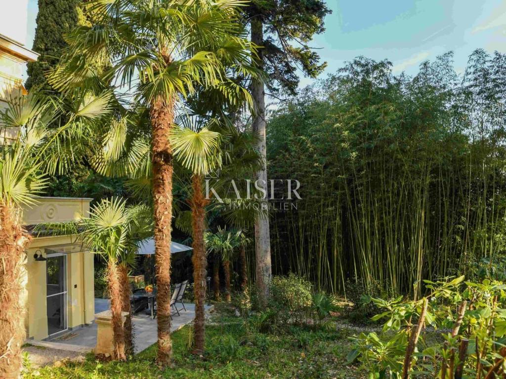 Stanu pripada terasa okružena lijepom okućnicom s bambusima i palmama i izlazom u opatijski park. Stan se nalazi u staroj opatijskoj vili izgrađene 1900. godine sa zasebnim ulazom, a stan je kompletno preuređen 2021. godine s kompletno novim instalacijama, ima podno grijanje i klimu.