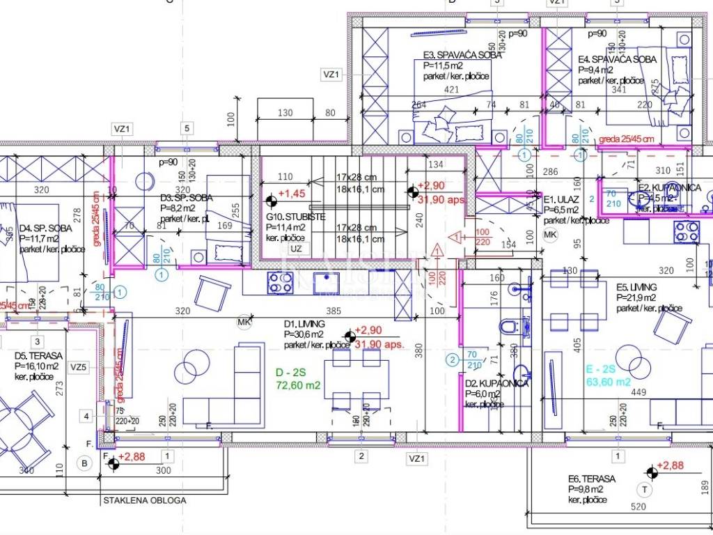 Stan se sastoji od ulaznog dijela (6,50 m²), prostranog dnevnog boravka (21,90 m²), dvije spavaće sobe (11,50 m² i 9,40 m²), kupaonice (4,50 m²) i natkrivene terase (9,80 m²). Neto površina stana iznosi 63,60 m².