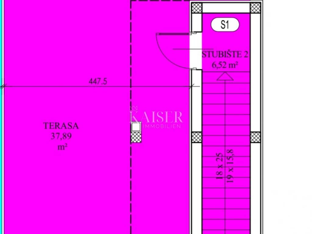 Otvoreni koncept kuhinje, blagovaonice i dnevnog boravka (24,10 m2), idealan za obiteljska okupljanja i opuštanje.Dvije prostrane spavaće sobe (11,36 m2 i 14,13 m2), koje nude privatnost i mir.Ostava (4,14 m2) povezana sa spavaćom sobom, osigurava dodatan prostor za organizaciju.Moderna kupaonica s WC-om (4,51 m2), opremljena vrhunskim sanitarnim elementima.Hodnik i stubište koje vode na ekskluzivnu krovnu terasu.