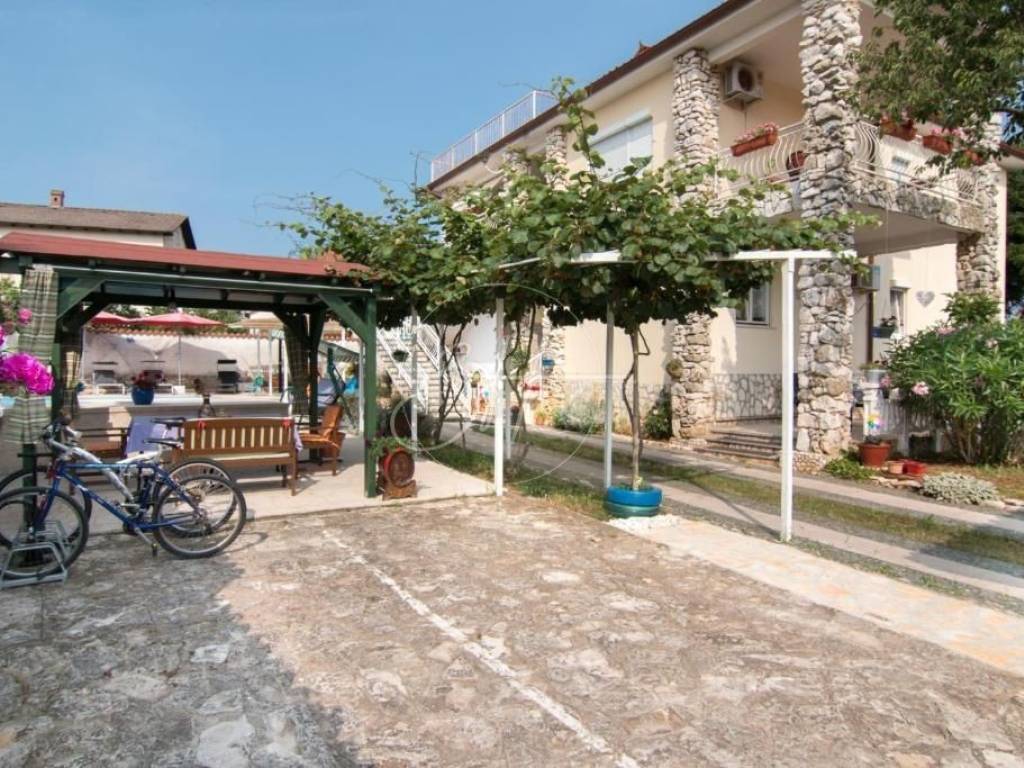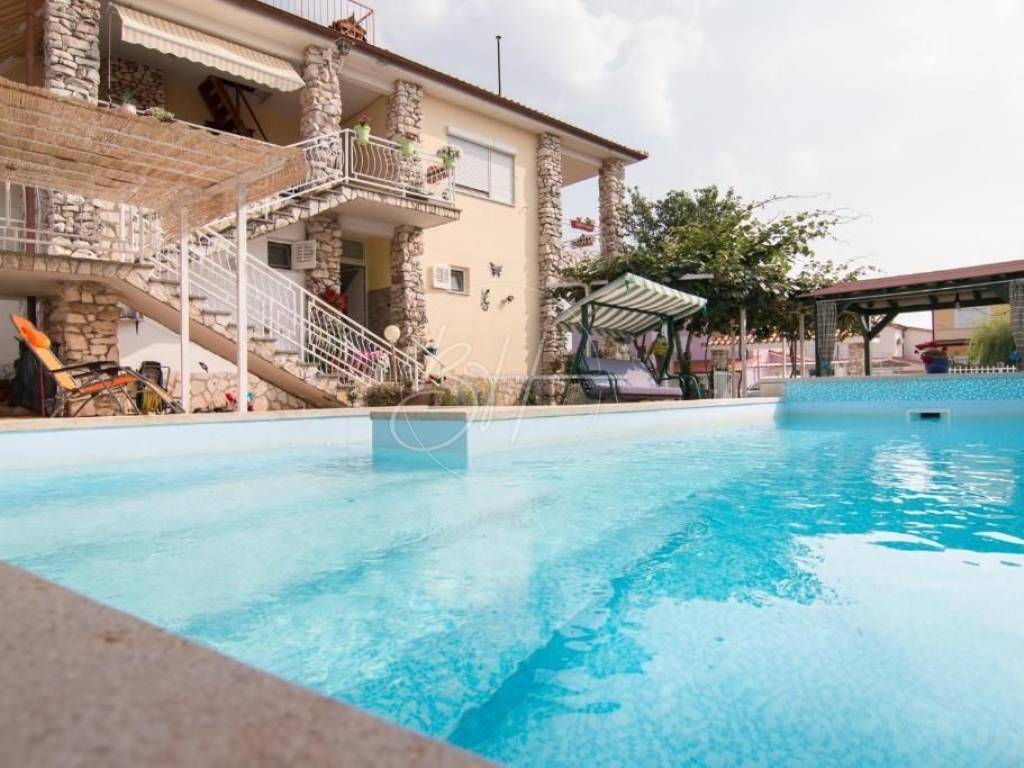 Na okućnici od 445m2 nalazi se veliki bazen, vrt, vanjska natkrivena terasa.