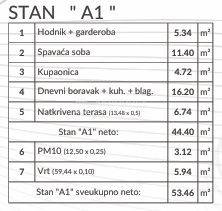 . Stan se sastoji od: dnevnog boravka sa kuhinjom, kupaona, hodnik, 1 spavaća soba, terasa i vrt 75m2. U prizemlju zgrade nalazi se spremište te stan ima jedno parkirno mjesto.
