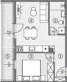 Stan se sastoji od: dnevnog boravka sa kuhinjom i blagovaonom, kupaona, hodnik, 1 spavaća soba ,lođa i parkirno mjesto