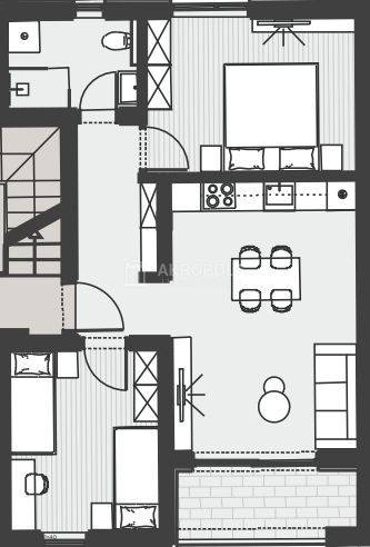 Stan se sastoji od : hodnik + garderoba, kupatila, 2 spavaće sobe, Dnevni boravak+ kuhinja+ blagovaona, lođa, ukupna neto površina 54,89 m2.