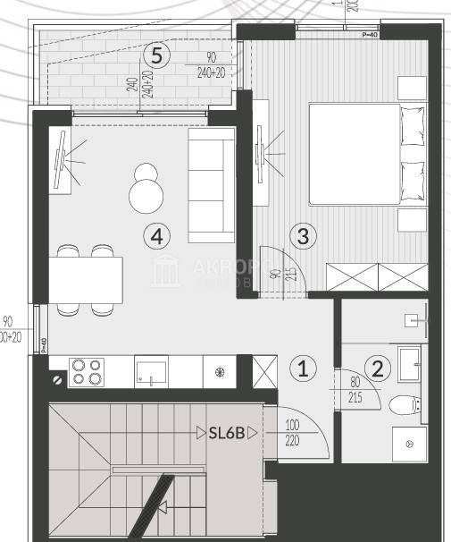 Stan se sastoji od : hodnik + garderoba, kupatila, 1 spavaće sobe, Dnevni boravak+ kuhinja+ blagovaona, lođa, ukupna neto površina39,21 m2.