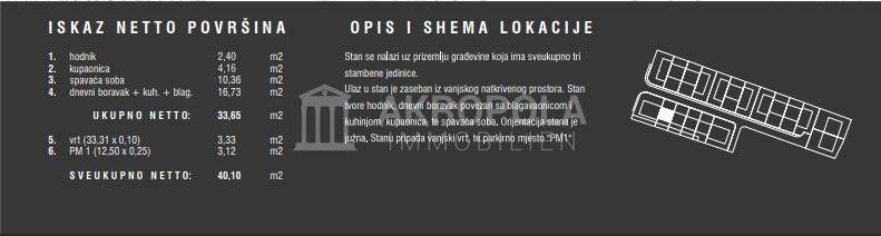 Stan se sastoji od : hodnika,kupatila,Dnevni boravak+ kuhinja+ blagovaona ukupna neto površina 33,65 m2.