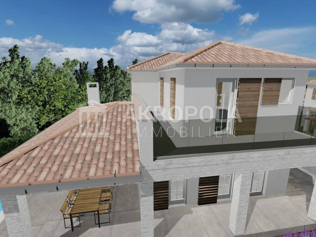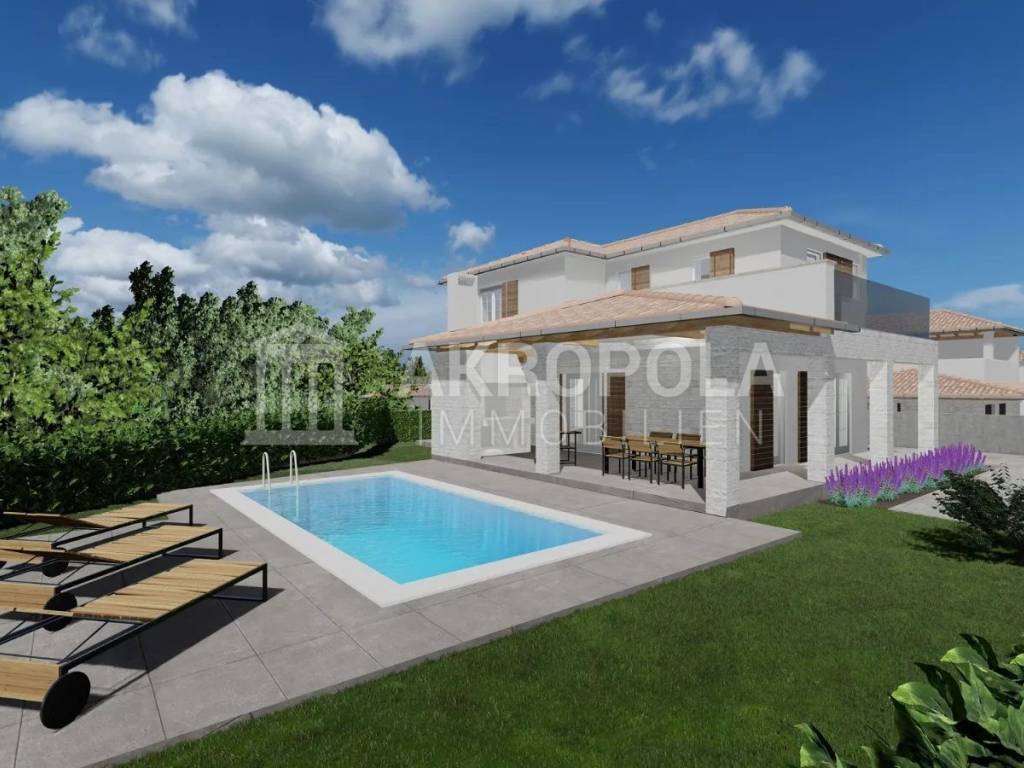 Vila stambene površinu od 155 m2 te ograđenu okućnicu od 497 m2 s bazenom i dva parkirna mjesta. Prizemlje vile sastoji se od velikog dnevnog boravka, kupaonice i kuhinje. Unutarnje stepenice vode na prvi kat koji se sastoji od 3 spavaće sobe i 3 kupaonice, svaka soba ima svoju kupaonicu i 1 wc, te izlaz na terasu. Dnevni boravak ima izlaz na veliku natkrivenu terasu na kojoj se nalazi ljetna kuhinja i produžetak prema bazenu.