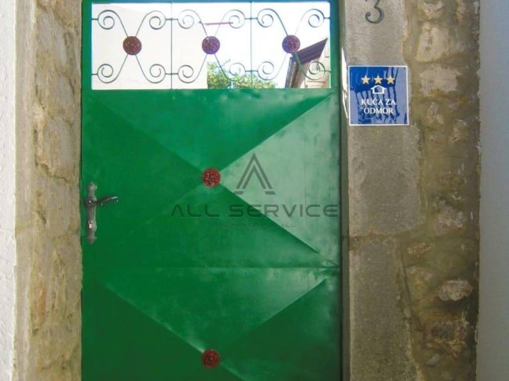 Kuća se sastoji od kompletno ograđenog kamenog dvorišta iz kojeg se s dvije strane ulazi u open space boravak s blagovaonicom i kuhinjom i kupaonicom na donjoj etaži, te prostrane terase i dvije spavaće sobe od kojih jedna ima wc na gornjoj etaži. Etaže su povezane vanjskim kamenim stepenicama.