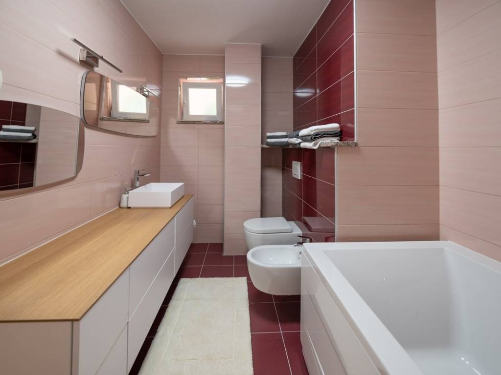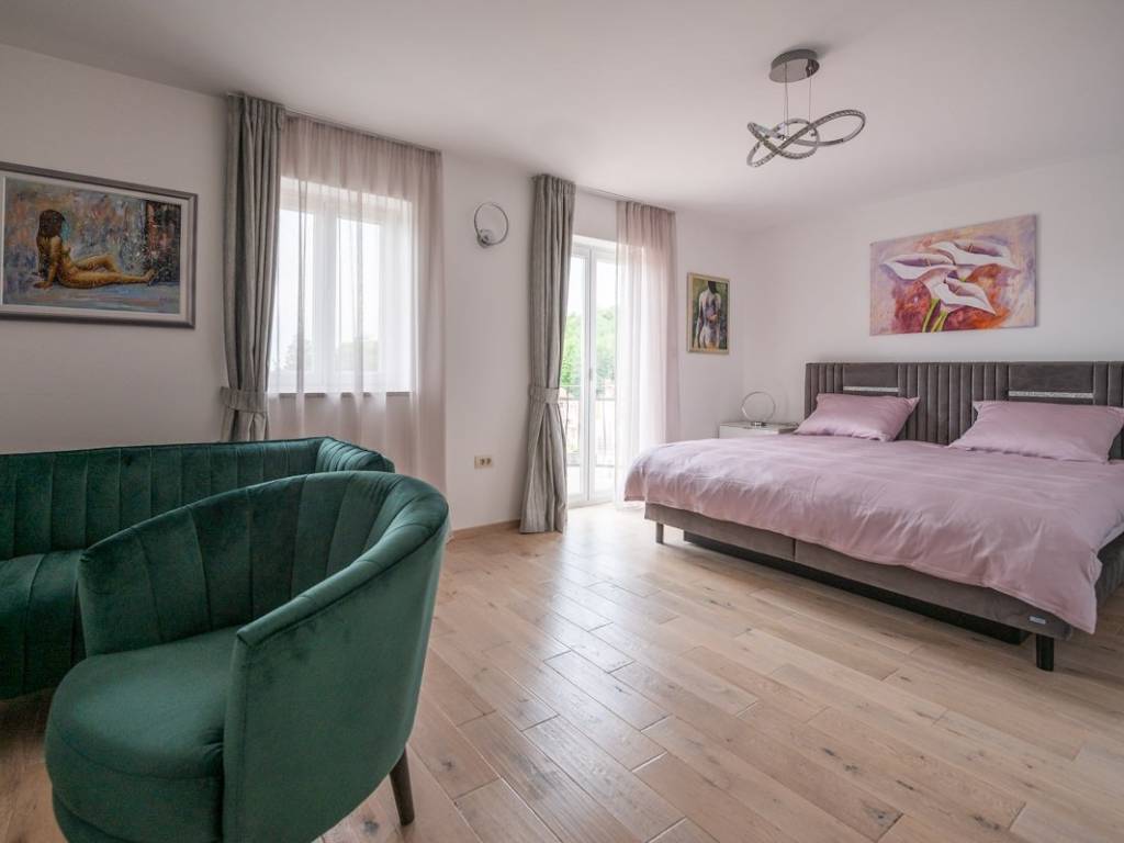 U suterenu se nalaze garaža za dva do tri osobna vozila, vešeraj, wc i spremište. Unutarnjim stepenicama povezano je i prizemlje u kojem imamo predivni dnevni boravak sa izlazom na balkon, wc, spremište, kuhinju i blagovaonu sa izlazom na terasu gdje se nalazi bazen, te mjesto za druženje na otvorenom sa kaminom. U dnevnom boravku se također nalazi i unutarnji kamin za dobar ugođaj zimi. Nadalje unutarnjim stepenicama dolazimo na sljedeću etažu gdje se nalaze dvije sobe, svaka sa svojom osobnom kupaonom, te balkonom i terasom, kao i još jedan dodatni wc. Također ova kuća ima i još tri sobe u potkrovlju sa posebnim odvojenim ulazom od kojih svaka ima svoju posebnu kupaonu i priključke za mini kuhinju. Kuća je predviđena za obiteljski život sa mogućnosti turističkog iznajmljivanja dodatne tri samostalne sobe ili studia, ili pak iznajmljivanje cijele kuće u vidu turizma.Cijela kuća se iznajmljuje za 4000 eura,jedan stan sa garažom